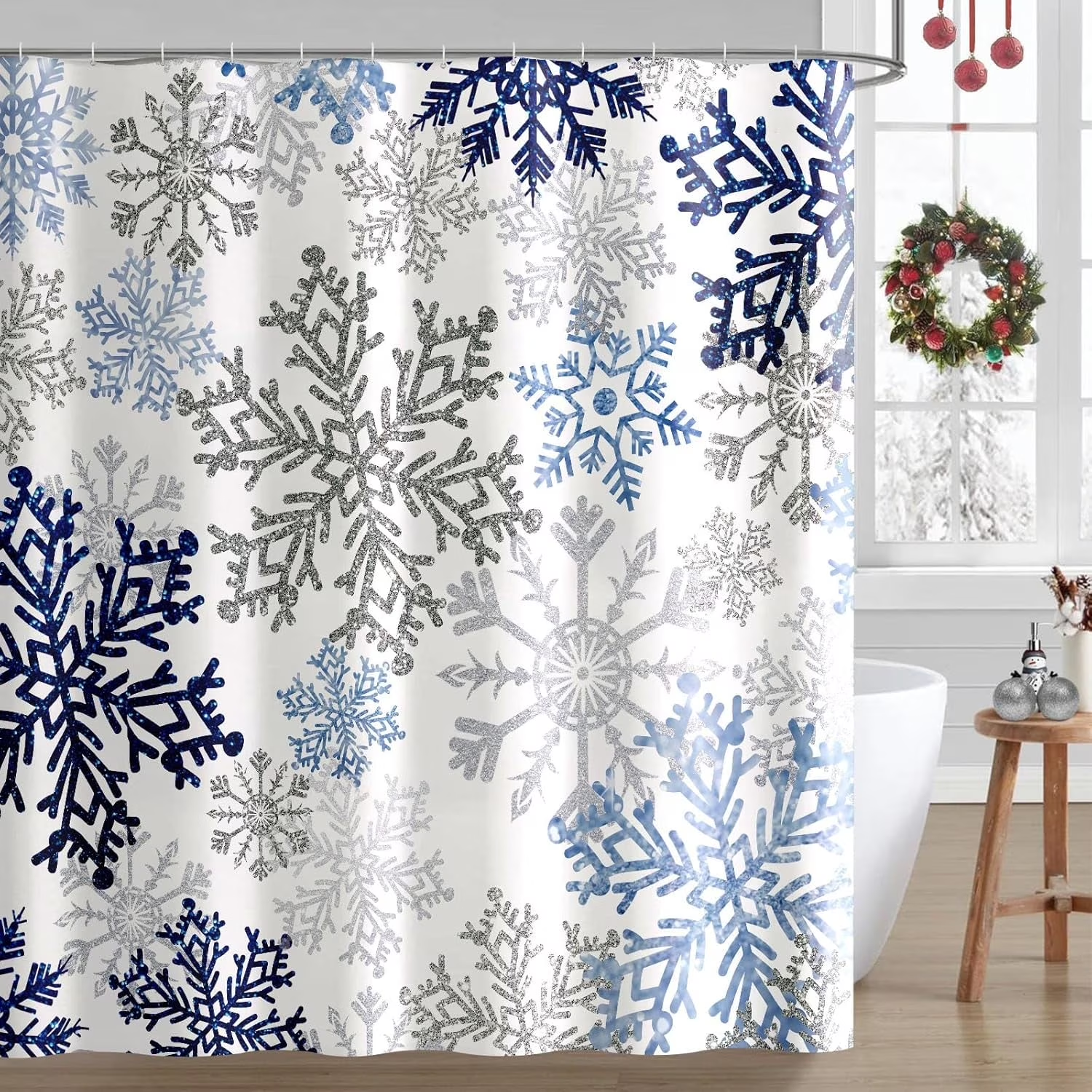 - Christmas Shower Curtain for Bathrooms: Classic snowflake pattern in soft blue-gray tones makes this shower curtain ideal for your Christmas, New Year's or winter decor. It is the perfect way to bring the beauty of the season into your bathroom. Add holiday cheer to your bathroom with this Christmas shower curtain, perfect for snowy winter bathroom decor.